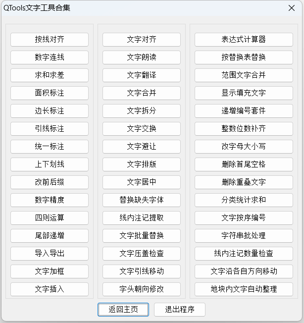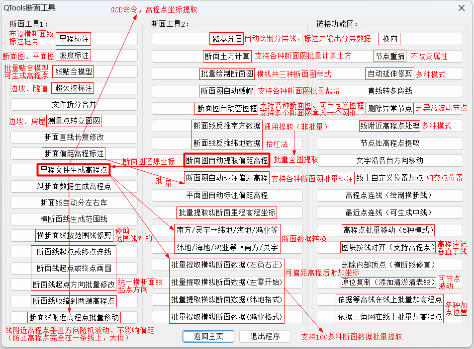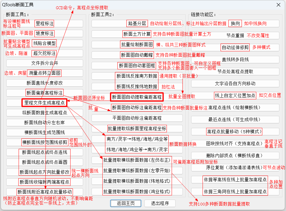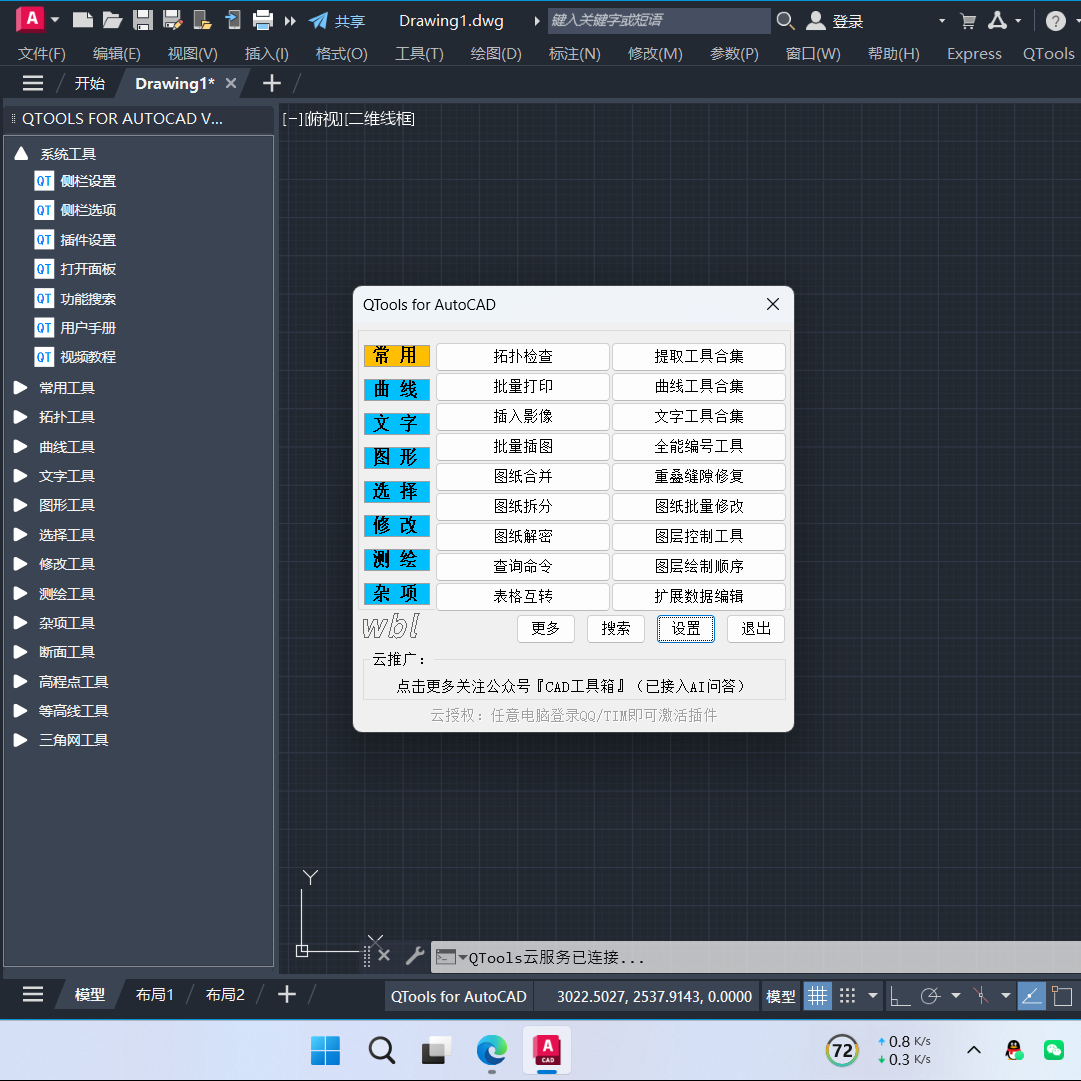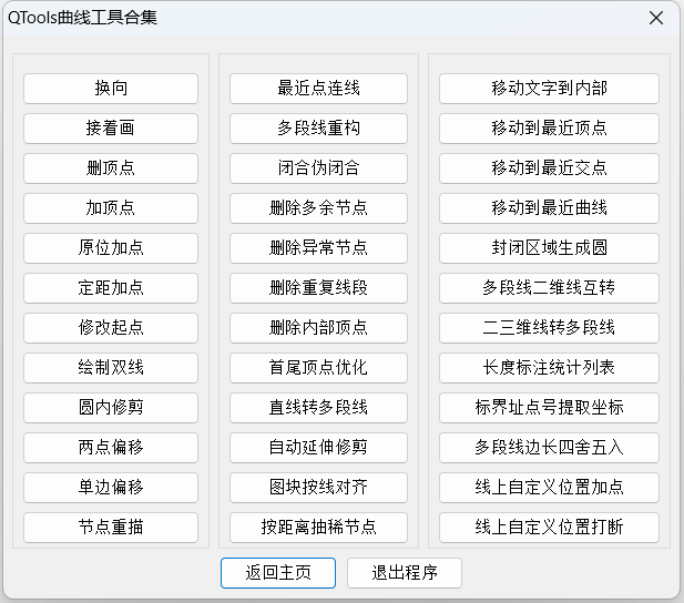 “QTools”是一款CAD/CASS辅助工具,功能主要涉及测绘、设计行业,含断面工具、高程点工具、等高线工具、三角网工具、曲线工具、文字工具、编号工具、提取工具、拓扑检查、缝隙修复、路基分层、自动套图框等400多个实用功能;插件全面支持AutoCAD全系列和中望CAD2026及以上版本;支持自定义快捷键、菜单栏、侧边栏、自动更新。